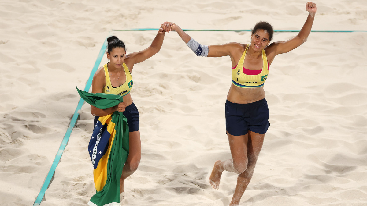 Top-seeded Brazilian pair Ana Patricia Silva and Eduarda Santos won Olympic gold in the women's beach volleyball on Friday, finally nailing down victory after three tense sets in a bad-tempered game.