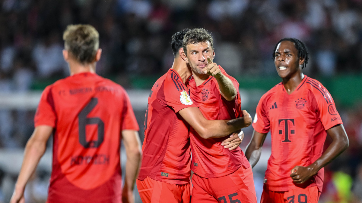 Thomas Mueller scored twice in three first-half minutes as Bayern Munich beat second-division Ulm 4-0 in the German Cup on Friday in their first match under coach Vincent Kompany.