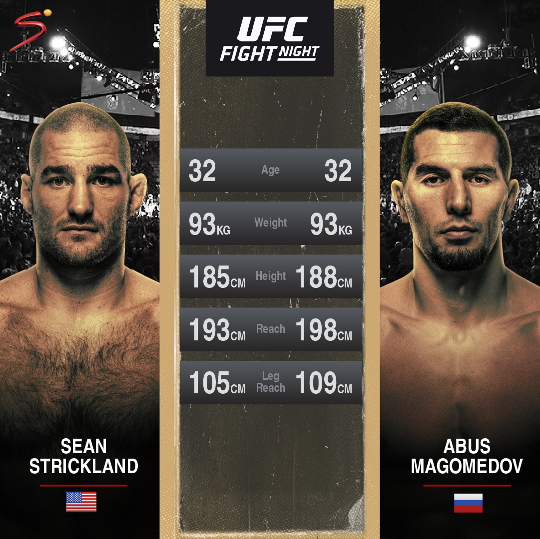 Sean Strickland will face the challenge of newcomer Abusupiyan ‘Abus’ Magomedov when the pair meet in the middleweight main event of a UFC Fight Night at the APEX Facility in Las Vegas on the morning of Sunday 2 July 2023.