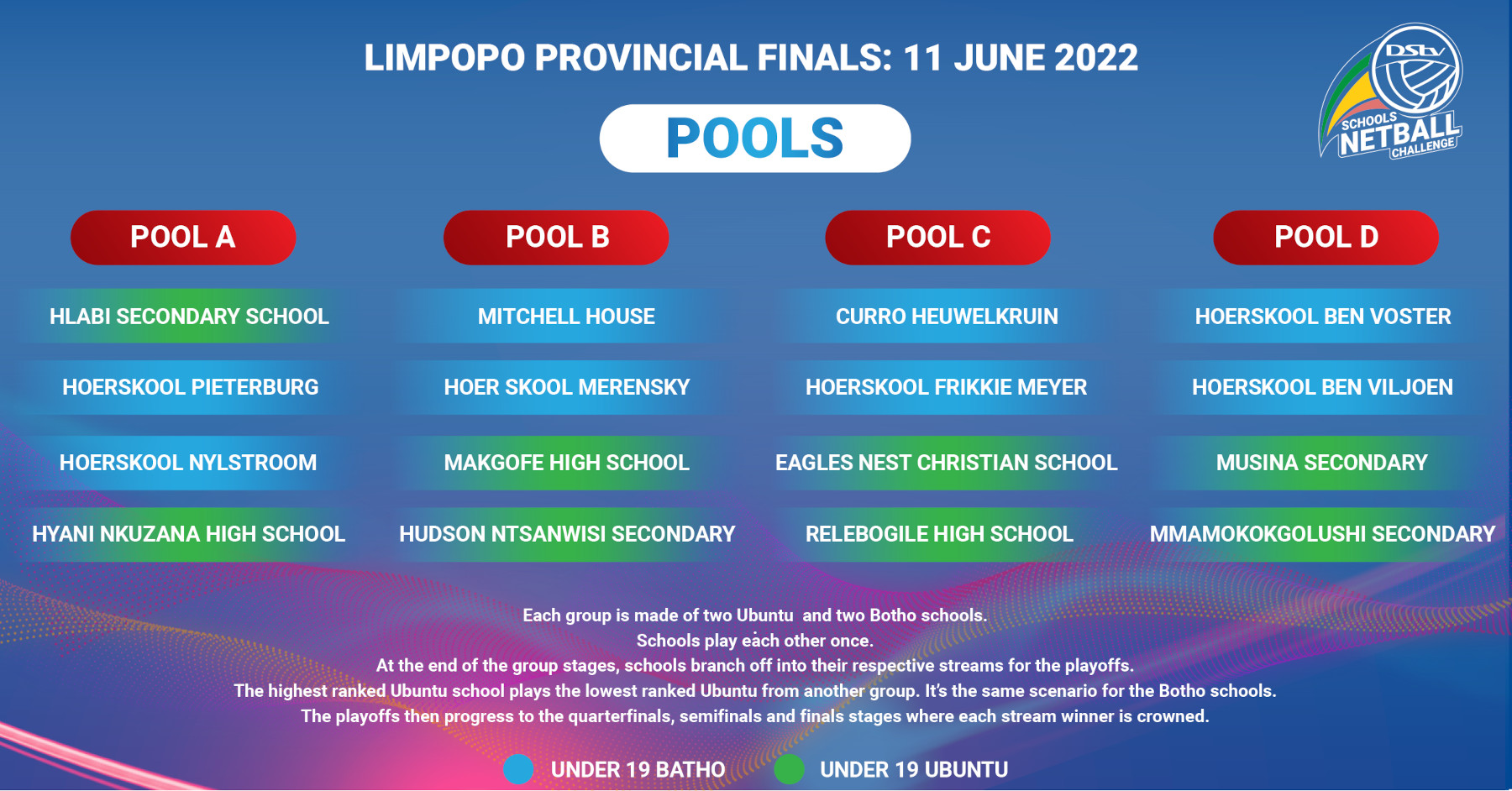 The schools are divided into four groups of four with each group consisting of two teams from each stream. Schools in each group play each other once before branching off to their respective streams for the quarterfinals where the top finishing Ubuntu school from in a group plays the second finishing Ubuntu school from the next group B. The scenario is the same for the Botho schools.
