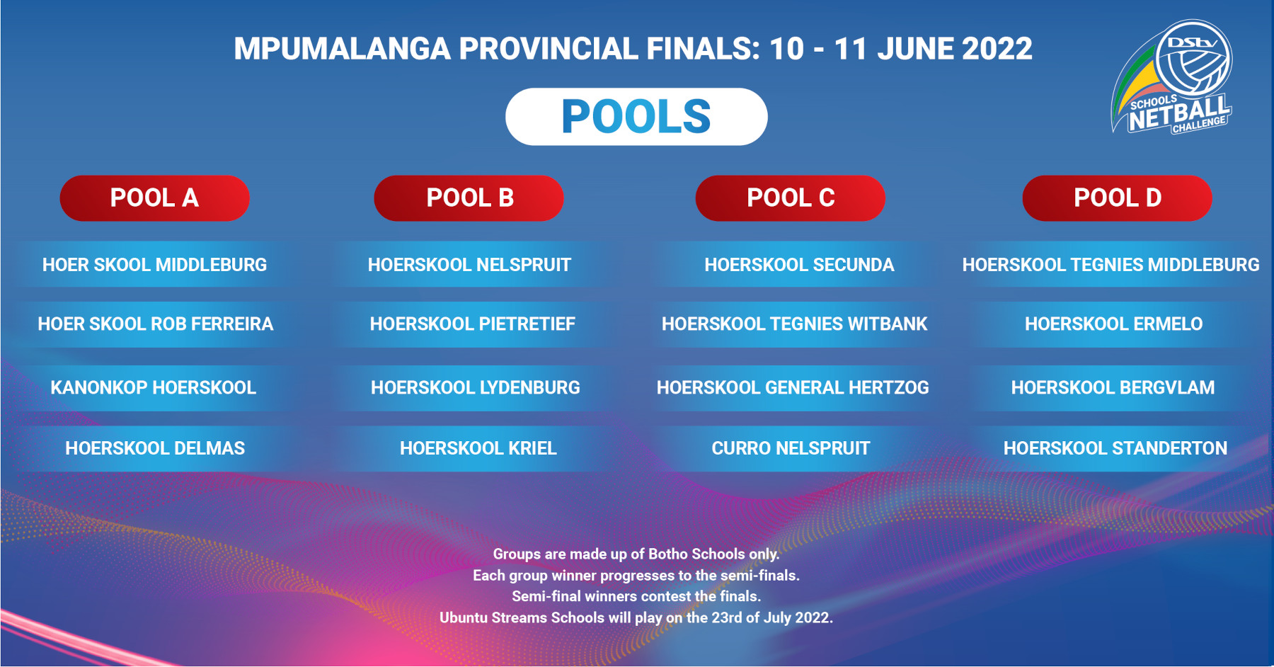 Mpumalanga will host the Ubuntu and Botho streams competition separately. The Botho region, which hosts urban areas school, will be the first while Ubuntu will follow on the 23rd of July at Hoërskool Middelburg.