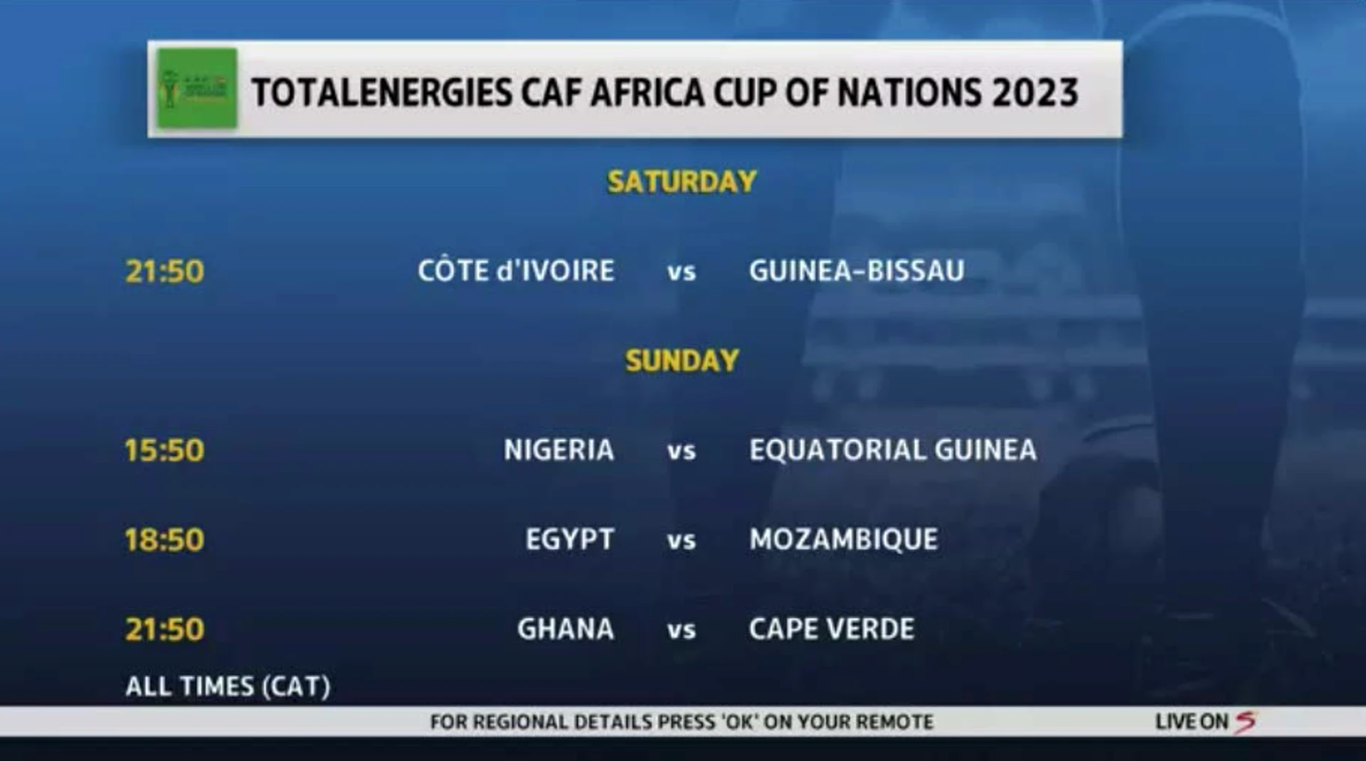afcon fixtures for Saturday and Sunday
